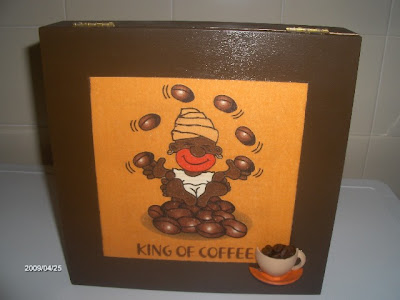Esta caixa foi feita com a tecnica do gurdanapo, coloquei uma chávena em cerâmica e para lhe dar um pequeno toque ainda lhe apliquei grão de café.